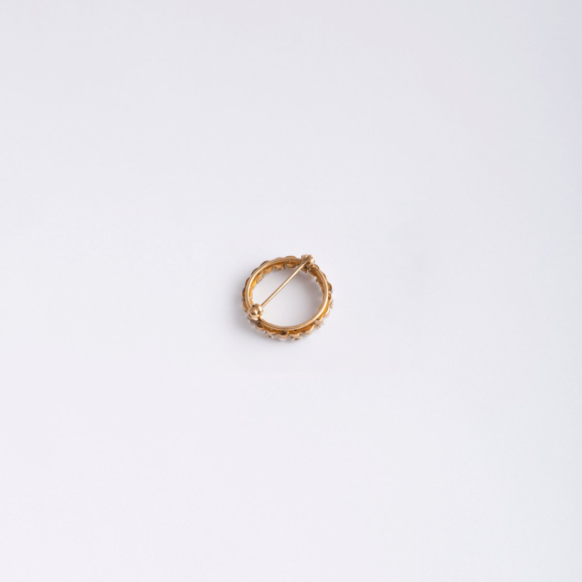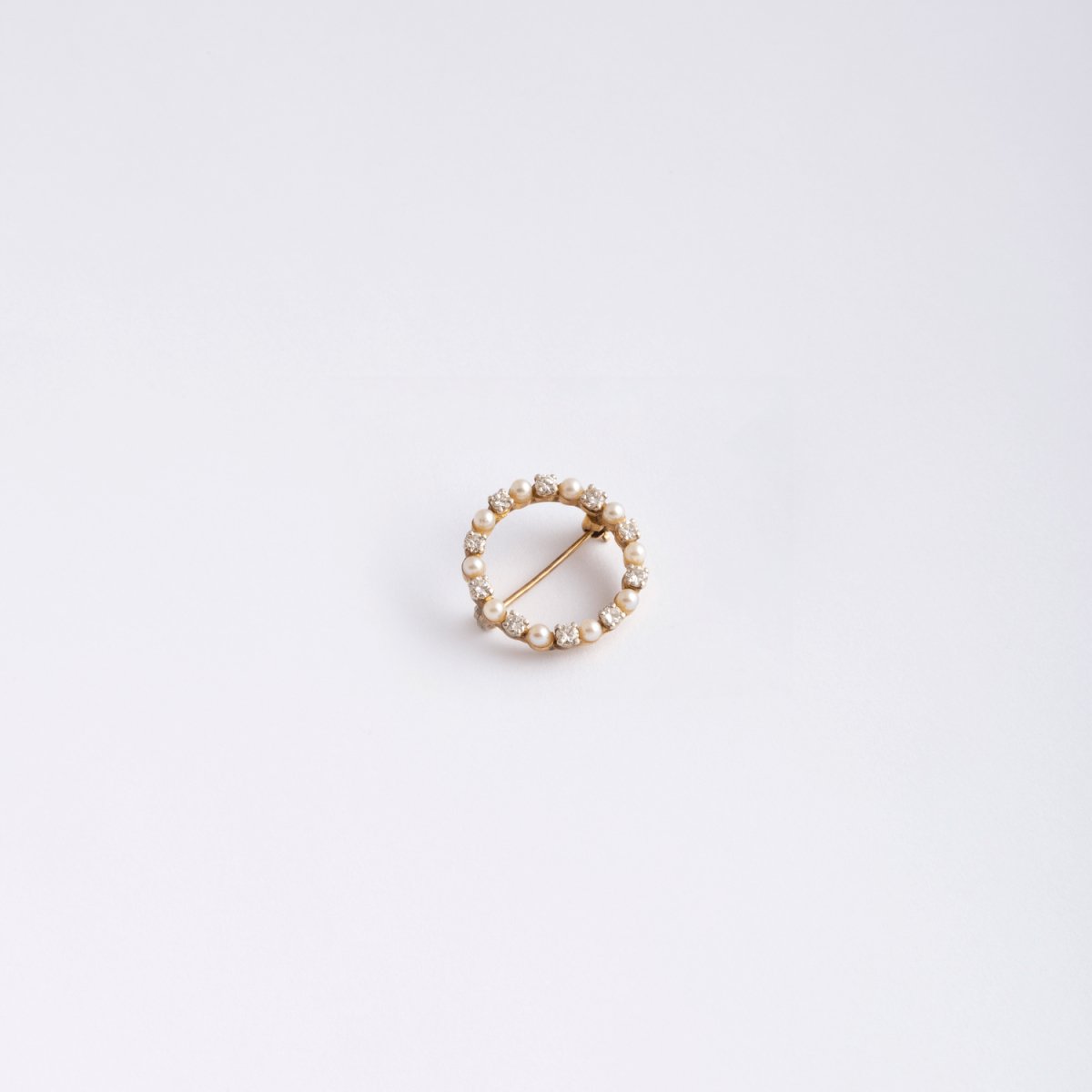 Round circular brooch in 18-carat yellow gold adorned with diamonds and fine pearls Gross weight: 2.94 g Diameter: 2 cm Ref: 5794A