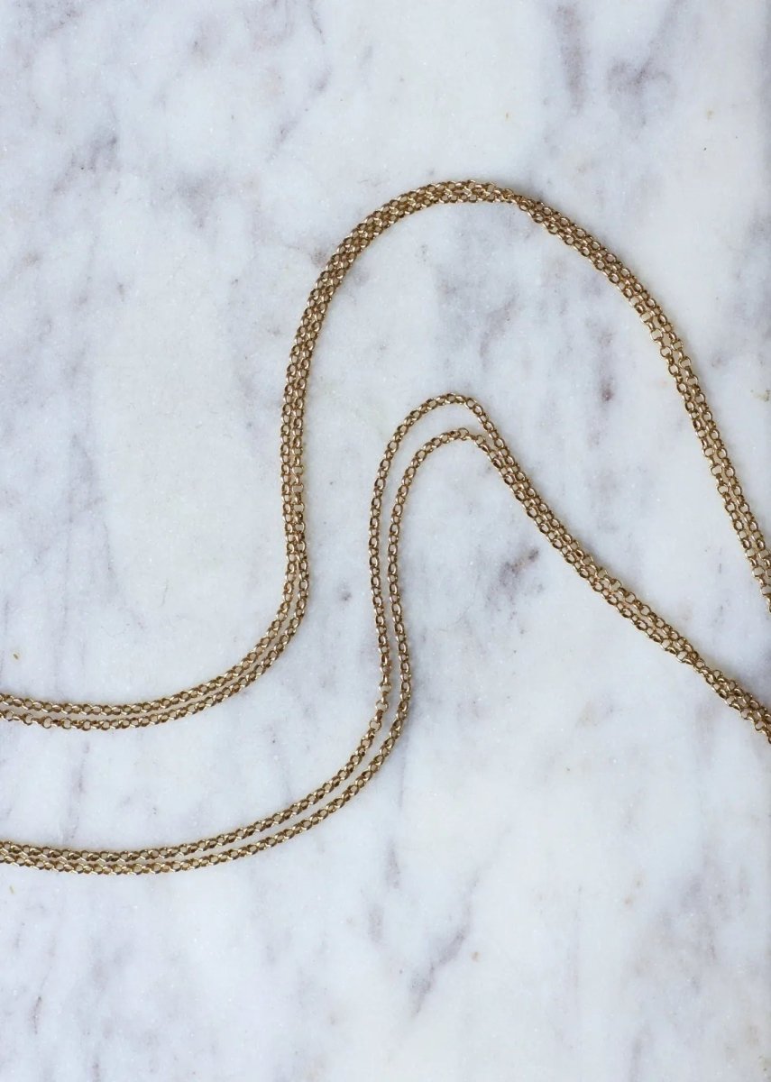 Fine necklace, long old jaseron mesh chain, in 18Kt yellow gold (eagle's head hallmark). Rectangular clasp beautifully carved with foliage. French work, early 20th century. Gross weight: 6.77 g Length: 105.00 cm Link width: 0.16 cm Clasp dimensions: 1.10X 0.27cm Condition: very light micro scratches on the gold parts, see photos. One chain, a multitude of possible combinations: this necklace can be worn in a single row as a sautoir, as a double choker, or even as a bracelet, with or without other antique chains and pendants . All our antique necklaces