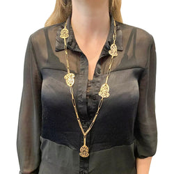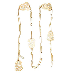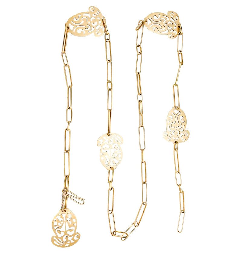 A long necklace signed by Maison Pomellato, “Ming” model, in sandblasted 750/000 pink gold, enhanced with 5 openwork Asian-inspired motifs, the main one of which is held by a link set with brown diamonds. Dimensions of the patterns: 36 x 25 mm. Length: 920mm Weight: 81.3 grams Diamond weight: approximately 0.57 carat New price: 16,500