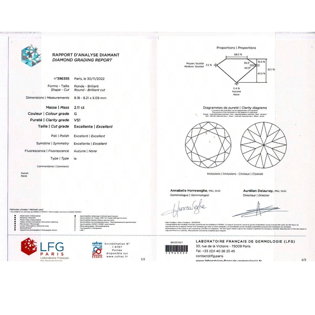 A ring signed by Maison Cartier, '1895' collection, in 950/000 platinum adorned with a brilliant-cut diamond weighing 2.11 carats, quality G/VS1. LFG certificate dated November 30, 2022 Weight: 7.2 grams. Diamond weight: 2.11 ct Finger size: 50